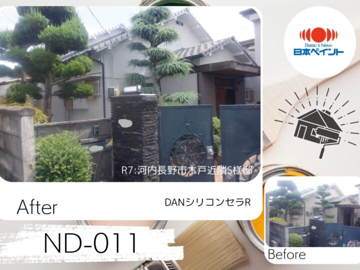 皆様、こんにちは ✨ 河内長野市・富田林市の外壁塗装・屋根リフォーム専門店ロードリバースの外壁塗装ブログをお読みいただき、 誠にありがとうございます! 私たちは、河内長野市を中心に、高品質の外壁塗装・屋根リフォーム工事をご提供しています! 引き続き外壁塗装ブログをお読みいただき、より良い外壁塗装・屋根リフォーム工事にして頂きたいです(^^♪ 今回ご紹介するのは、河内長野市にて施工した 外壁塗装工事のビフォーアフター事例 です。 施工前はベージュ系の外壁で落ち着いた印象でしたが、経年による汚れや色あせが進み、 お住まい全体がやや暗く見えてしまっていました。 そこで今回は、外壁全体を 日本ペイント「ND-011」 で塗り替えました。 ND-011はグレー系の中でも落ち着きと高級感を兼ね備えた人気色で、 周囲の植栽や黒い門扉との相性も抜群。施工後は清潔感のある明るい印象に生まれ変わり、 お住まいがぐっと引き締まった雰囲気になりました。 それではBefore&Afterをご覧ください。 After (写真:施工後) 【使用塗料】 外壁:日本ペイント/DANシリコンセラR ND-011 Before (写真:施工前) 施工前の状態 施工前は落ち着いたベージュ系の外壁でしたが、経年による色あせや汚れが見られ、 お住まい全体が少しくすんだ印象となっていました。 また、何カ所かひび割れも見られ、道路に面した外観部分は、第一印象を左右するため、 メンテナンスをご検討いただくきっかけとなりました。 (写真:施工前) (写真:施工前) 施工内容 外壁全体を塗り替え、劣化した部分はしっかりと下地補修を実施。 採用した塗料は高耐久・防汚性に優れたタイプで、長く美観を保つことができます。 カラーは清潔感のある明るいグレー系を選択。植栽や門まわりの黒い門扉とも調和し、 全体がすっきりと引き締まった印象に仕上がりました。 (写真:カット処理) (写真:コーキング充填仕上げ) 施工後の仕上がり 施工後は、お住まい全体が新築のような明るさを取り戻しました。 ・以前よりも外壁が引き締まって見える ・植木や玄関まわりがより映える ・お住まい全体に高級感と清潔感がプラス といった効果が感じられる仕上がりとなりました。 (写真:施工後) まとめ 外壁塗装は見た目の美しさだけでなく、建物を長持ちさせるためにも重要な工事です。 色選びひとつで印象が大きく変わるため、施工前にカラーシミュレーションを行うのもおすすめです。 河内長野市・富田林市で外壁塗装をご検討中の方は、ぜひロードリバースへご相談ください。 無料診断・無料お見積りを承っております。 外壁塗装・屋根塗装では、聞きなれない用語が出てきたり、 不安になることがあるかもしれませんが、 ロードリバースでは、 お客様にわかりやすく写真などを使いお伝えしております。 わからないこと、不安に思うこと、質問など お気軽にお問合せ、ご相談ください。 ※ご相談・見積依頼は無料ですのでお気軽にお電話ください。 また、ショールームへご来店が難しいお客様には、 送迎も可能ですし、メールやお電話、FAXでも対応可能ですので お気軽に、その旨をお伝えくださいね。 さらに、お問合せ専用のLINE公式アカウントもございますのでお気軽にご相談ください。 河内長野ショールーム電話番号:tel:0120-555-343 ☆ロードリバースでは河内長野市に外壁塗装・屋根塗装・屋根リフォームに関して気軽に相談ができる 「ショールーム」を完備しております♪ ロードリバース河内長野店 ショールームはこちらをクリック! ☆施工事例もぜひご覧ください♪ 施工事例集はこちらをクリック! ☆無料でご相談・診断~見積作成させていただきます♪ 無料お見積依頼・お問い合わせはこちらをクリック!外壁塗装事例Before&After